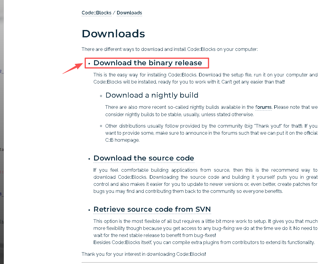 点击左侧的”Downloads“或者点击下载地址: https://www.codeblocks.org/downloads/