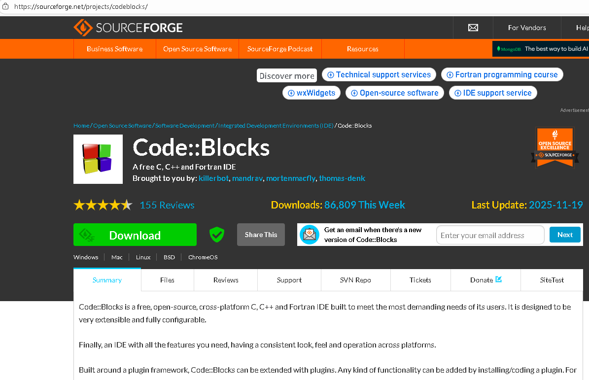 然后就会跳转到 https://sourceforge.net/projects/codeblocks/